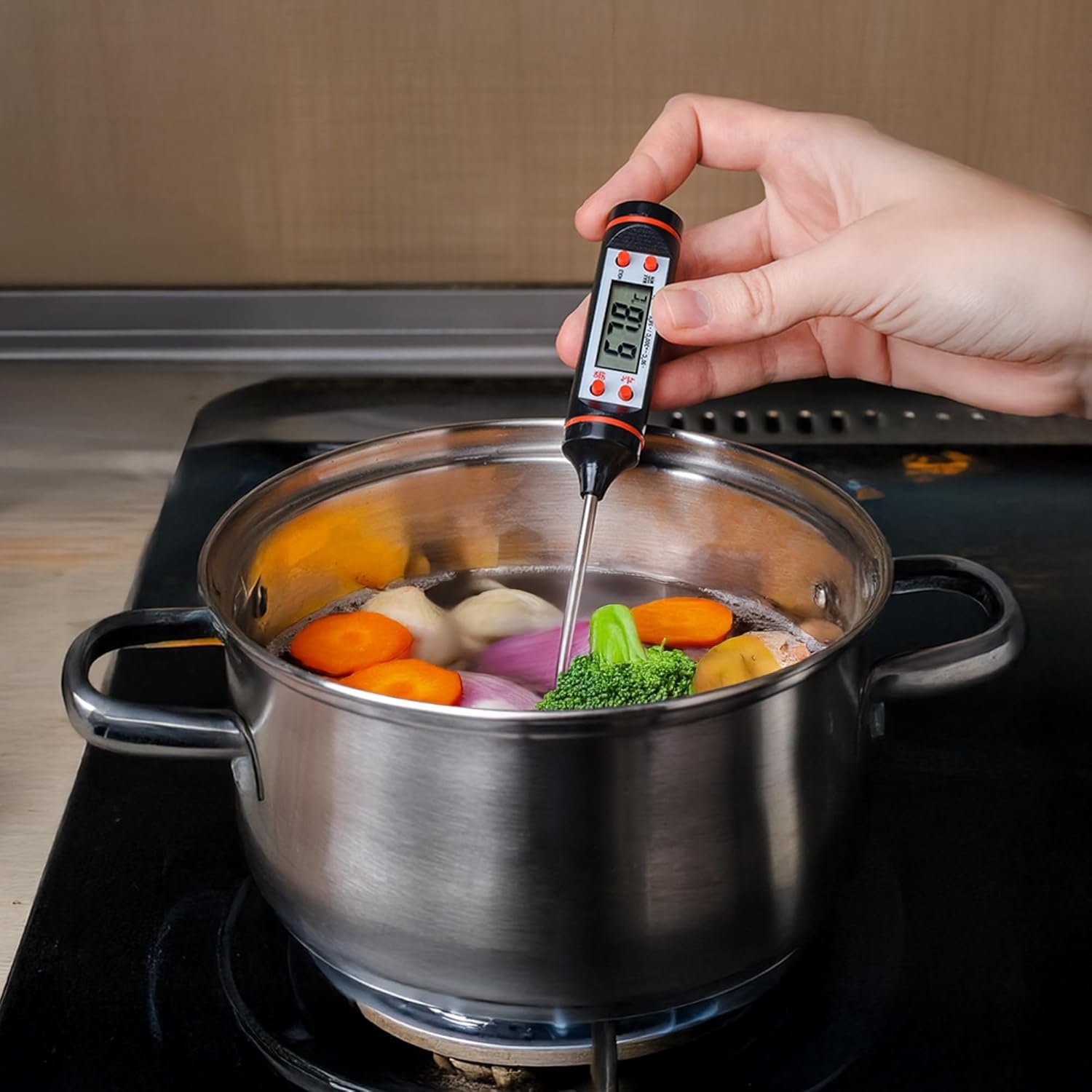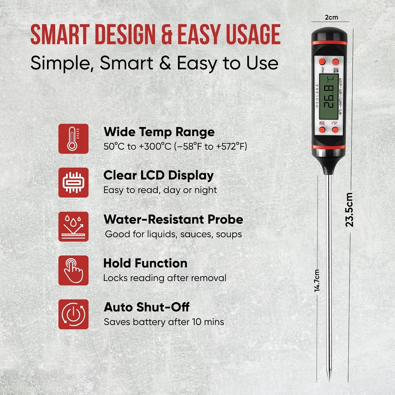 - Long stainless steel probe for testing all types of meat or food